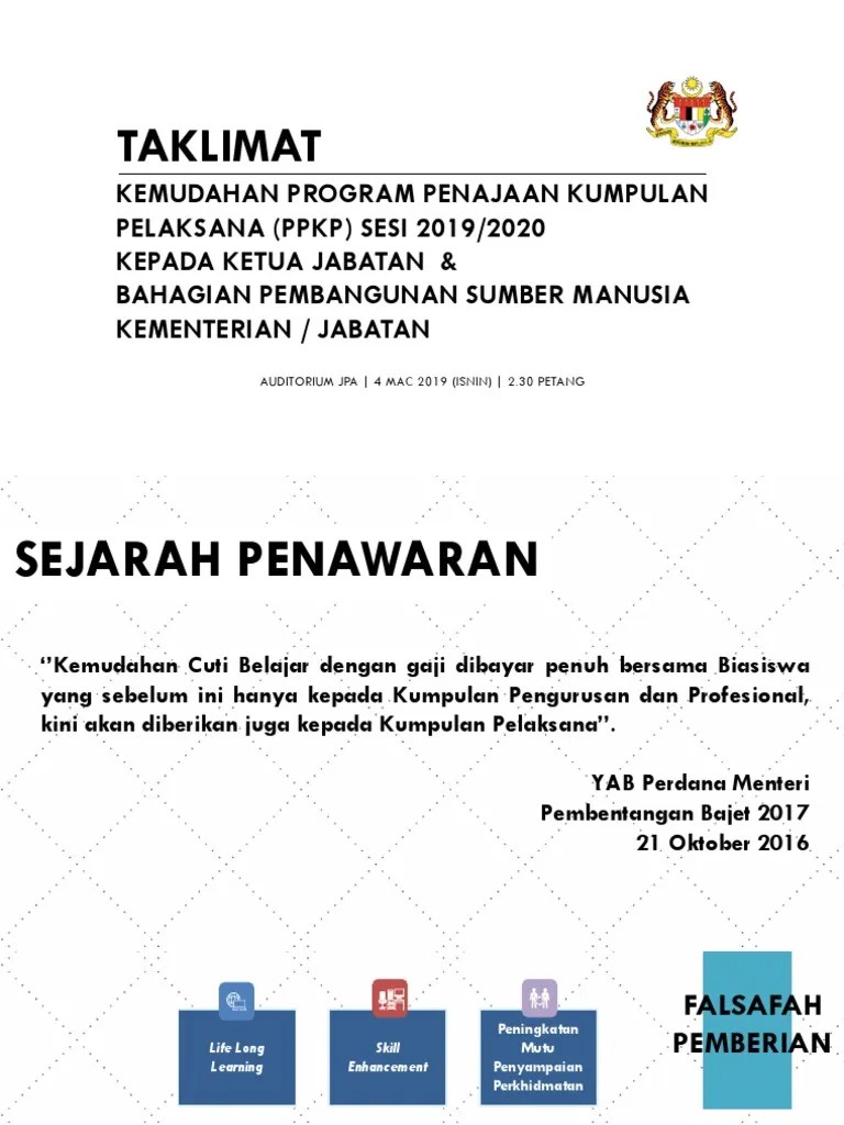 For more information and source, see on this link : Kemudahan tersebut sebelum ini hanya diberikan kepada penjawat awam di dalam kumpulan pengurusan dan profesional iaitu dari gred 41 dan ke atas. Cuti belajar bergaji penuh untuk kumpulan sokongan. Garis panduan kemudahan cuti belajar bergaji penuh pplv si bawah skills malaysia pdf document. Cuti belajar bergaji penuh bajet 2017. Pekeliling cuti belajar bergaji penuh bagi kumpulan pelaksana. Cuti belajar bergaji penuh bajet 2017. Cuti belajar bergaji penuh bajet 2017. Cuti belajar bergaji penuh untuk kumpulan sokongan 2017. Turn me up hadiah latihan persekutuan hlp cuti belajar bergaji penuh cbbp. Cuti belajar bergaji penuh untuk kumpulan sokongan 2019. Intipati bajet 2017 untuk penjawat awam sumber pendidikan. 6 touch points bajet 2017 bm final.