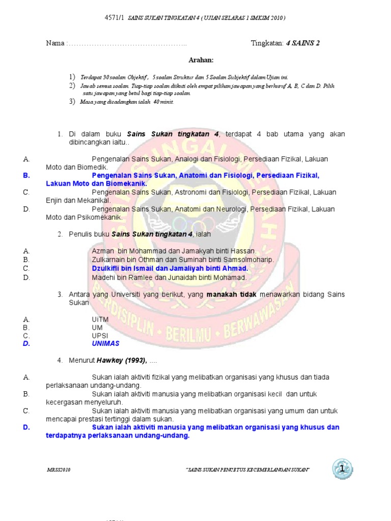 Soalan sains sukan tingkatan 4 pertengahan tahun kuora q. Kssm sains sukan tingkatan 5 7 kbat ialah keupayaan untuk mengaplikasi pengetahuan, kemahiran dan nilai dalam membuat penaakulan dan refleksi bagi menyelesaikan masalah, membuat keputusan, berinovasi dan berupaya mencipta sesuatu. Kerja projek sains sukan tingkatan 4 1.0 arahan kepada guru 1.1 guru hendaklah memberitahu calon arahan melaksanakan kerja kursus. Ujian kecergasan fizikal dan pelaksanaan ujian kecergasan fizikal. Kertas percubaan sains sukan kertas 2.